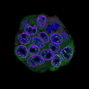© A micro-colony of mouse embryonic stem cells imaged by fluorescence in situ hybridisation and immunofluorescence. DNA is stained
