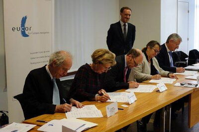 Die Eucor-Partneruniversitäten unterzeichnen anlässlich des 20-jährigen Bestehens von Eucor eine gemeinsame Erklärung zur Zusammenarbeit im Bereich der Doktorandenausbildung.